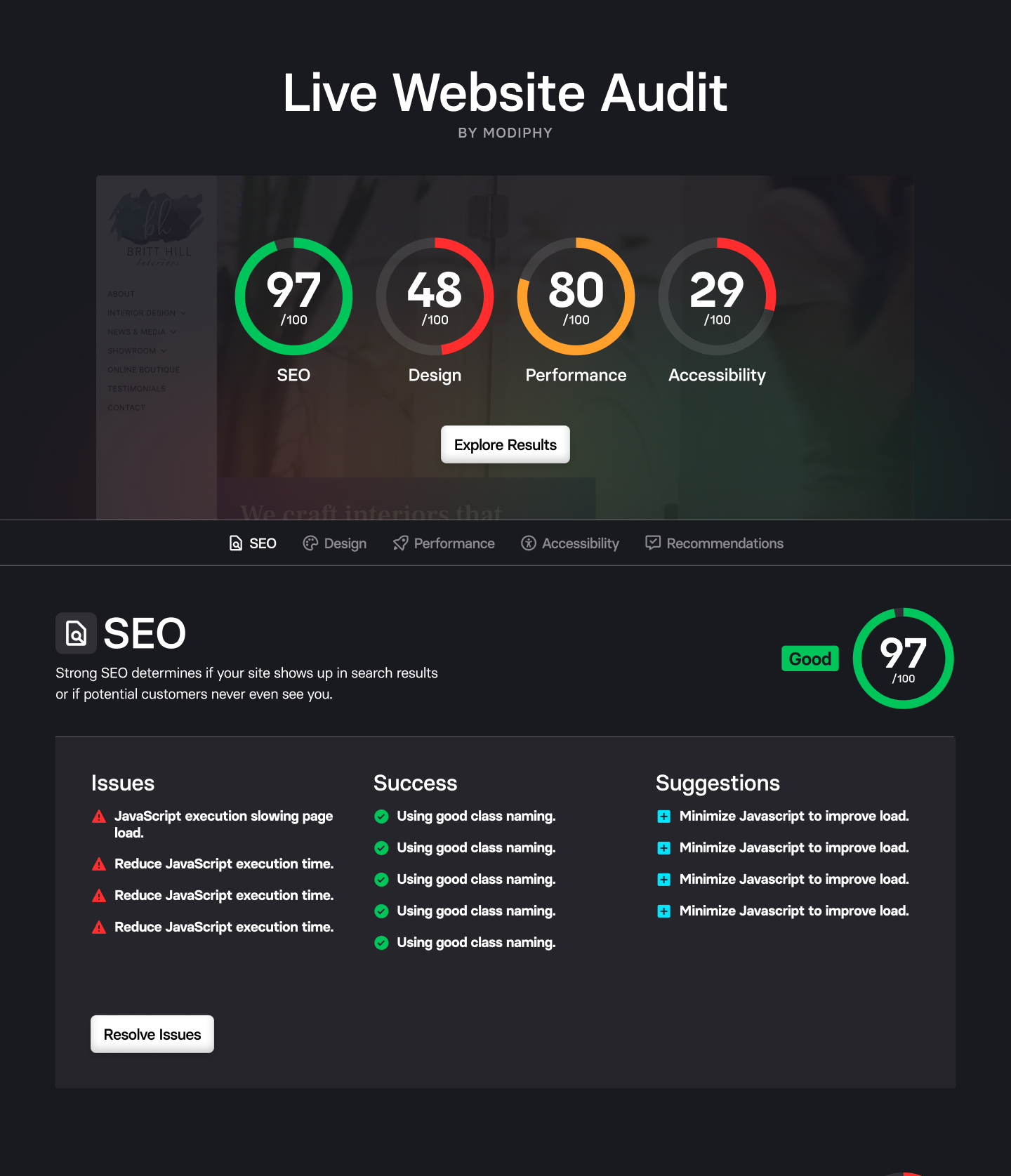- Clear scores for SEO, design, performance, and accessibility